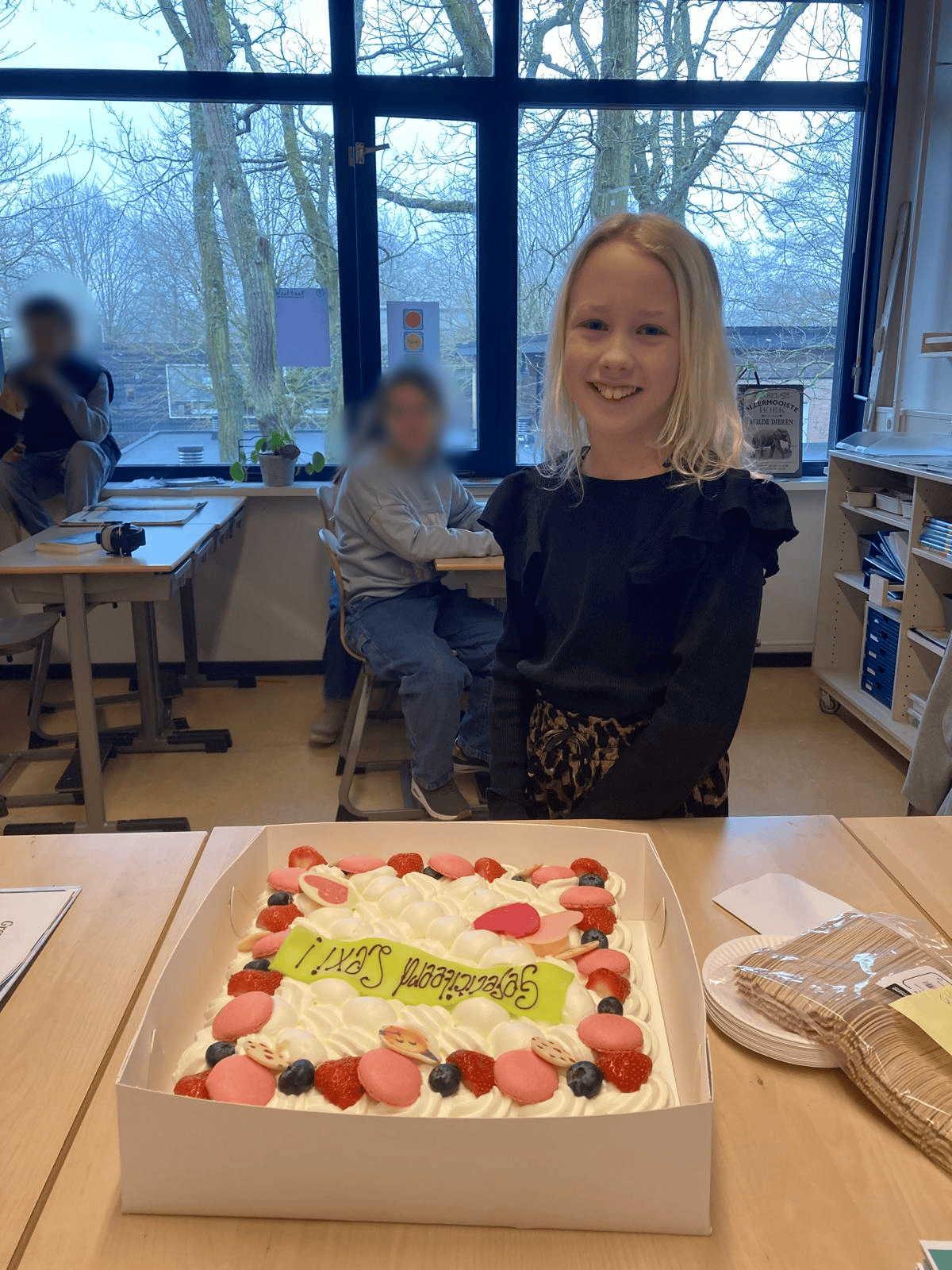 Vorige week stond er een grote verrassing op het programma. Mevrouw De Jager, docente economie, en mevrouw Kamphuijs, teamleider brugklas, verschenen onverwacht in de klas van de winnares, mét een prachtige taart. De kinderen reageerden uitzinnig: er werd gejuicht, het “bedanktlied” werd gezongen, Lexi sneed trots de taart aan en natuurlijk werd er meteen gesmuld.